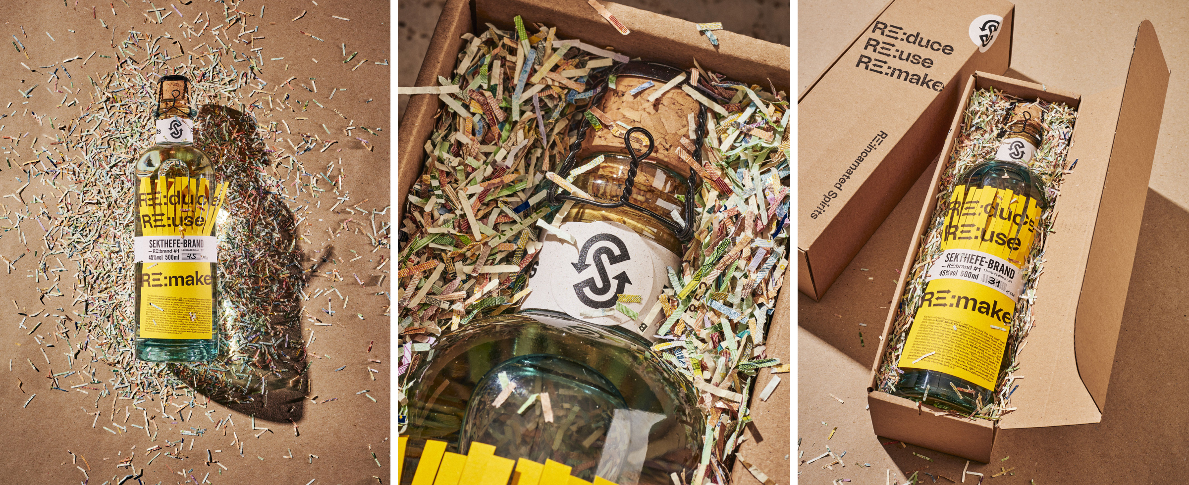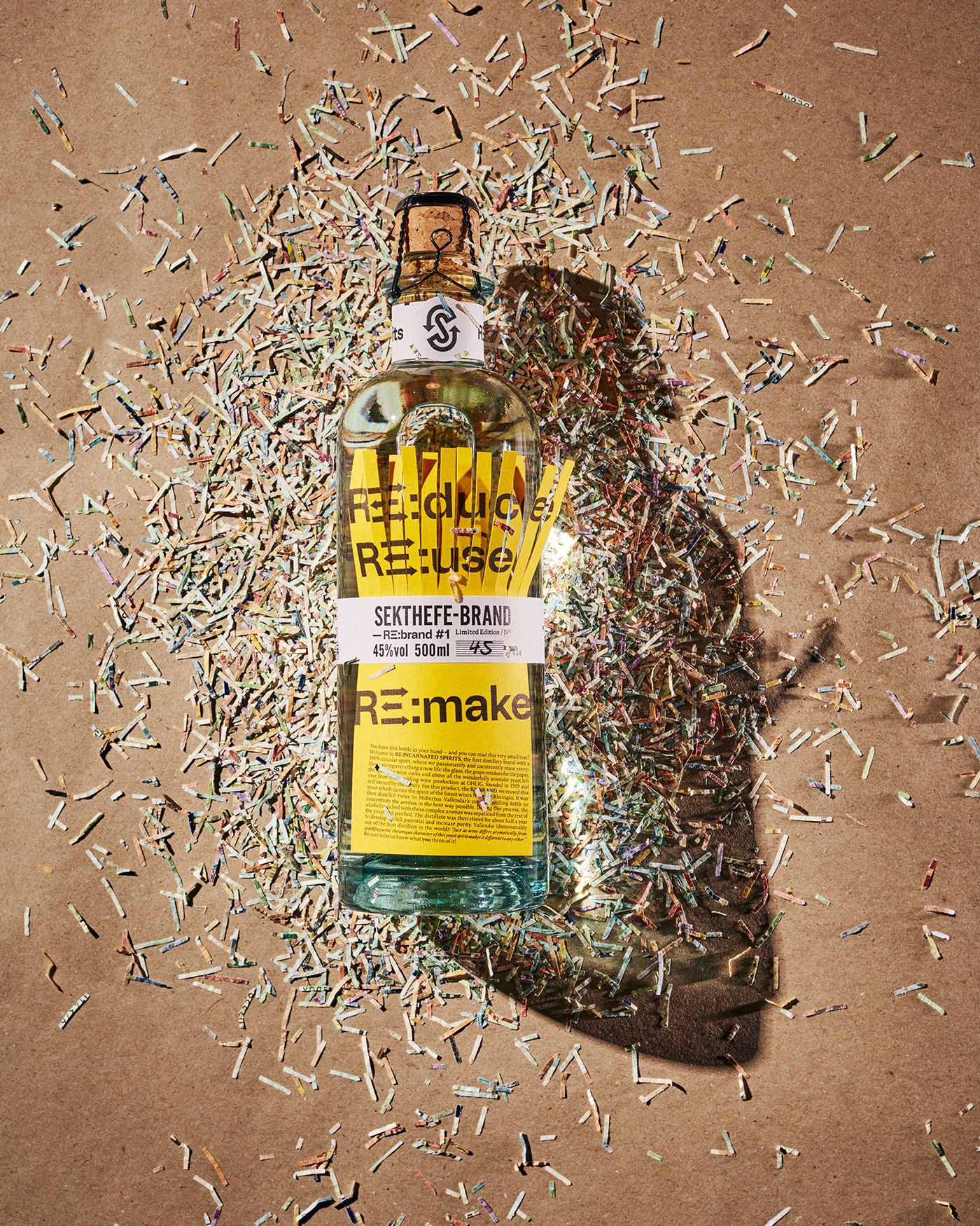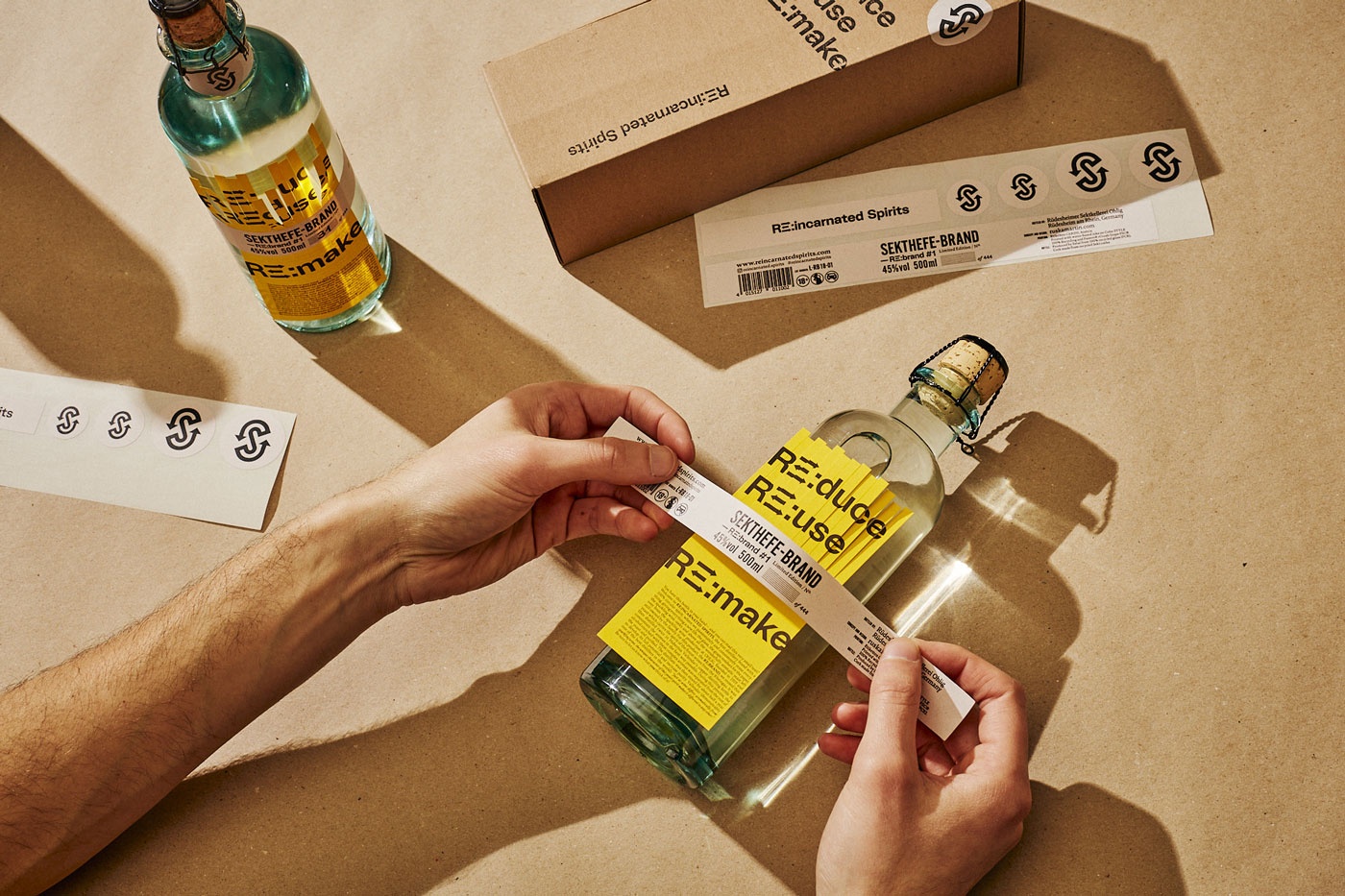 RE:INCARNATED SPIRITS is the first distillery brand with a 100% circular spirit and packaging design, where everything is passionately and consistently reused, giving all elements a new life. The first limited edition – a set of 444 unique bottles – of RE:INCARNATED SPIRITS is named RE:BRAND #1, using the German word Brand (spirit).
